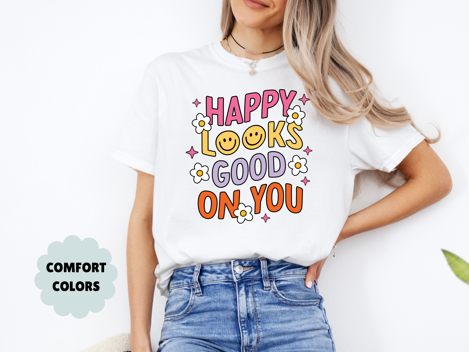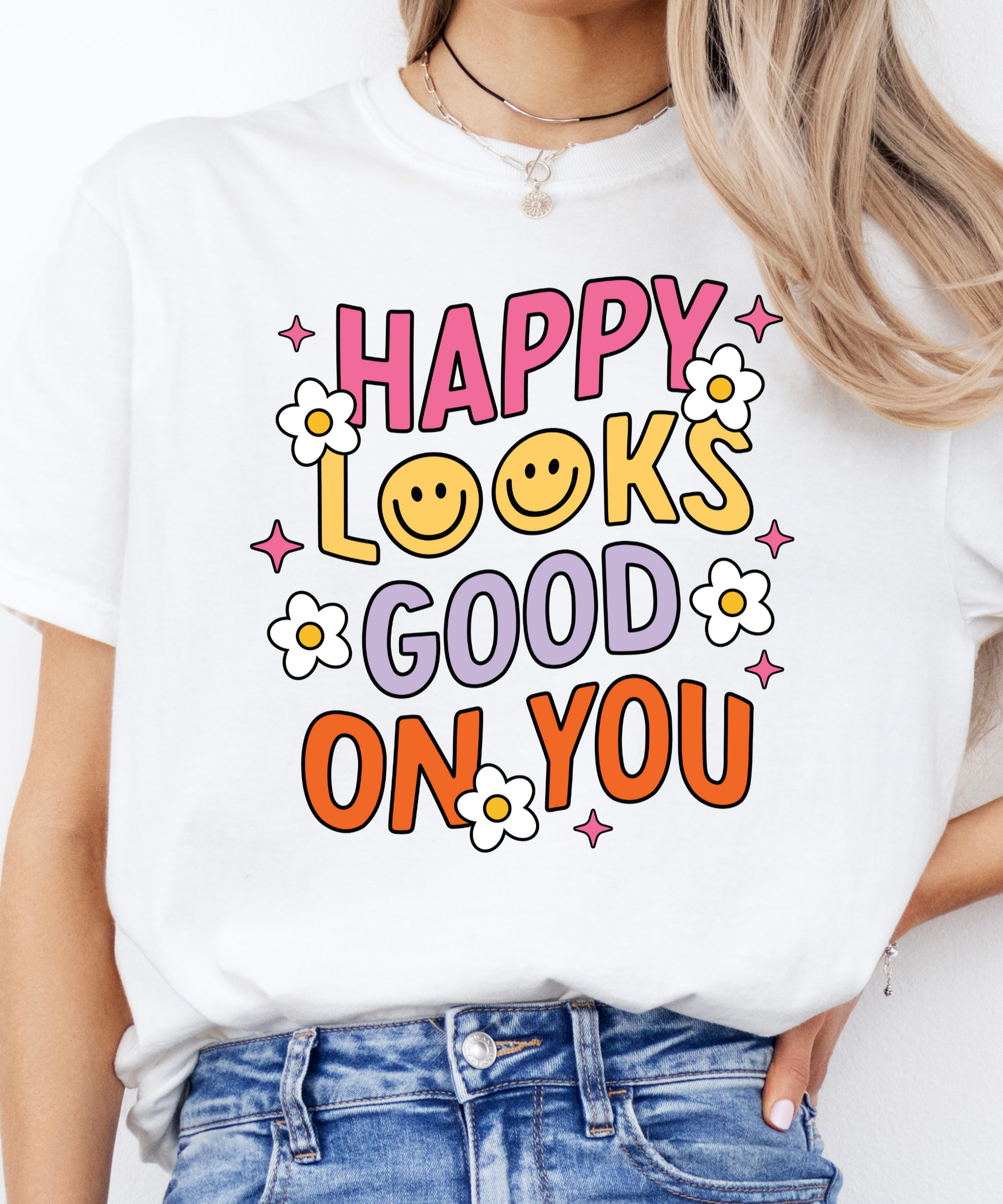 -Design: pink, yellow, purple, and orange font with smiley faces, daisies, and stars