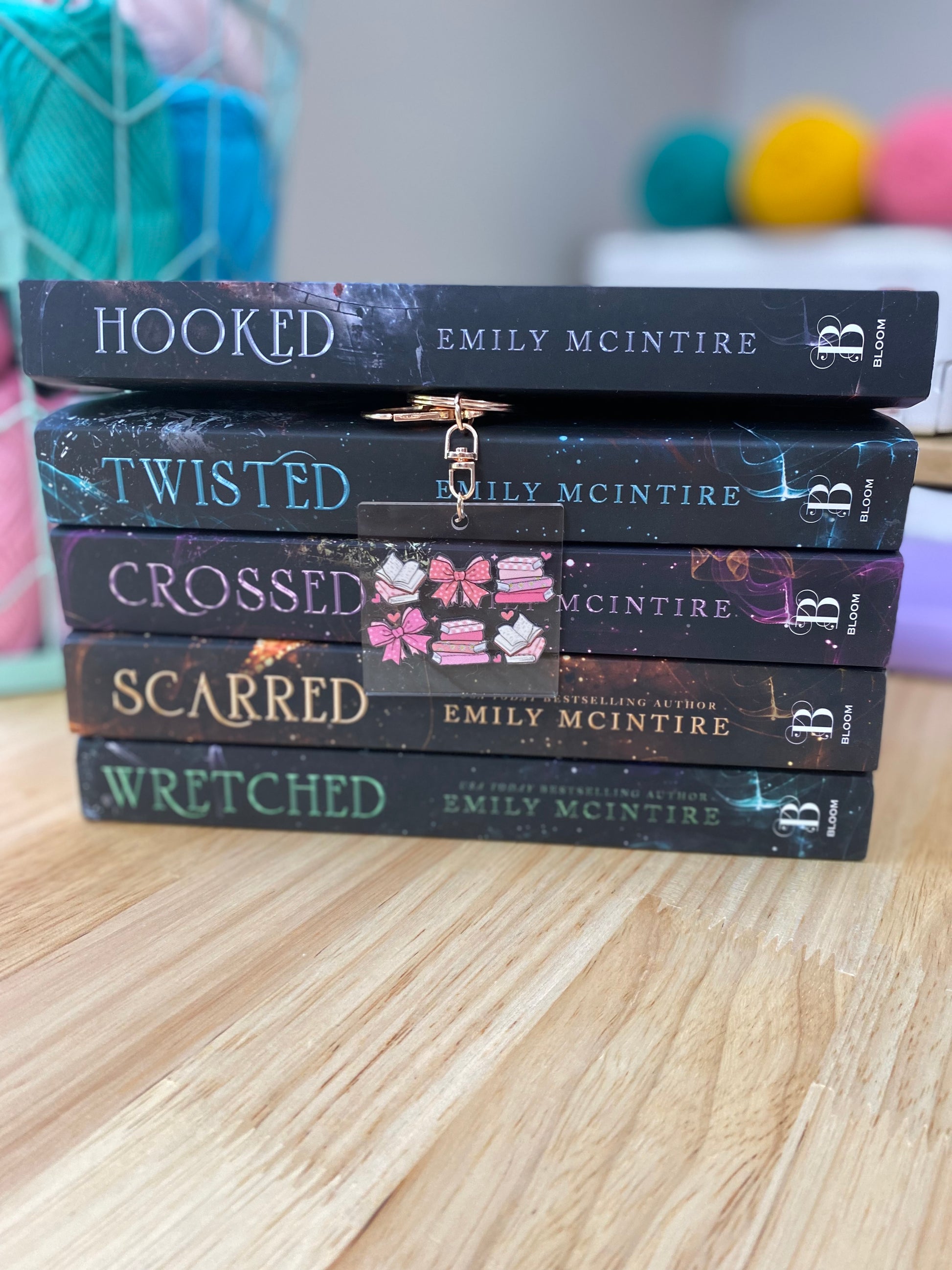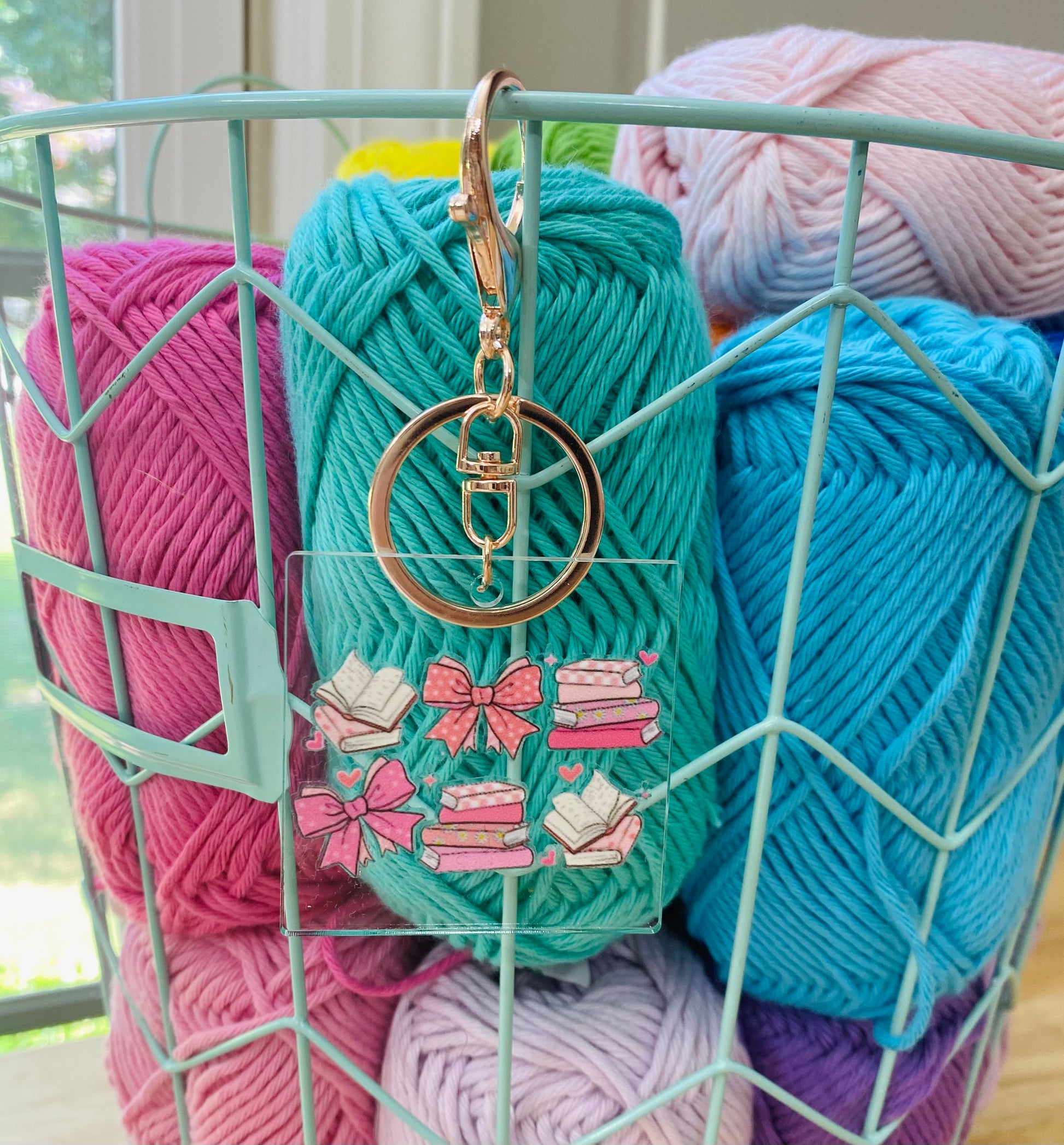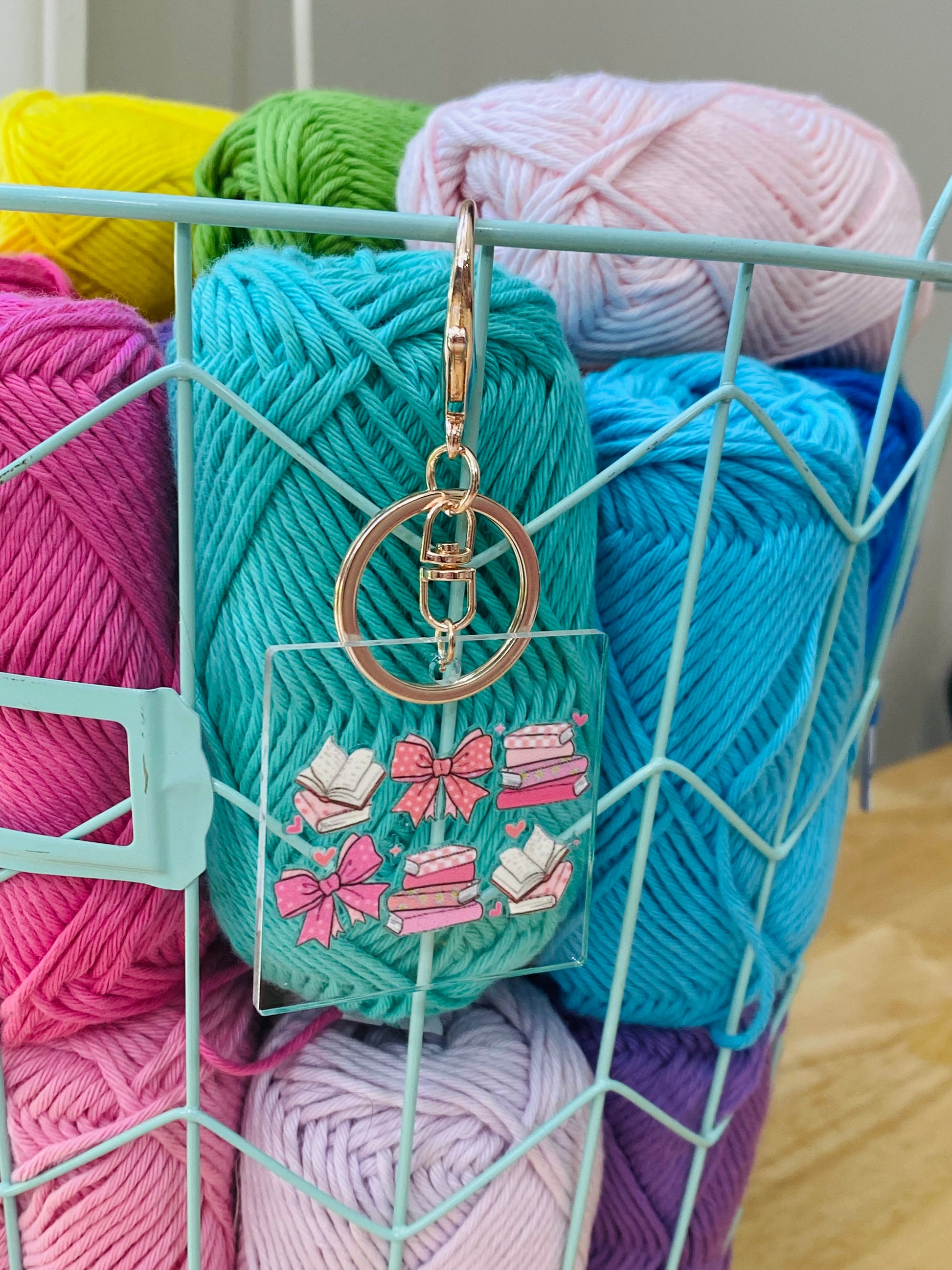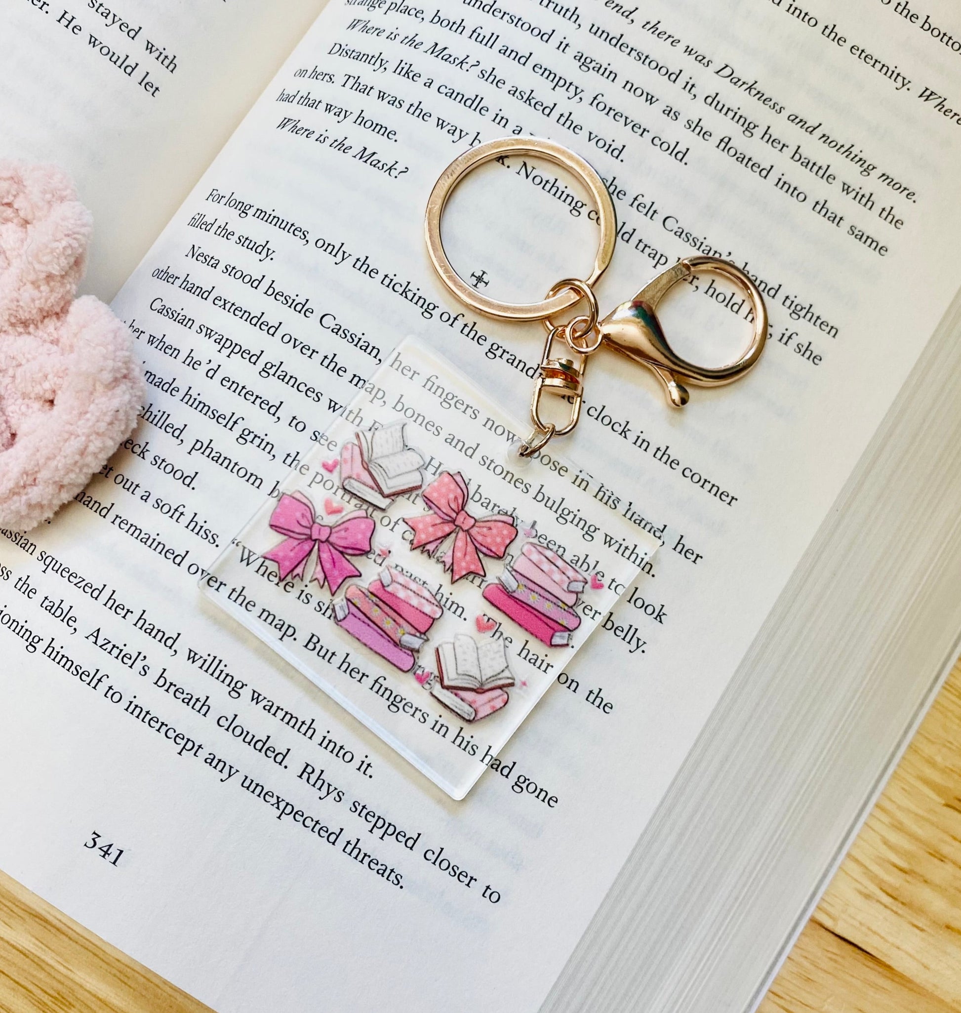 Pink Bows and Books Keychain, Acrylic Keychain with Rose Gold Clasp, Bookish Keychains