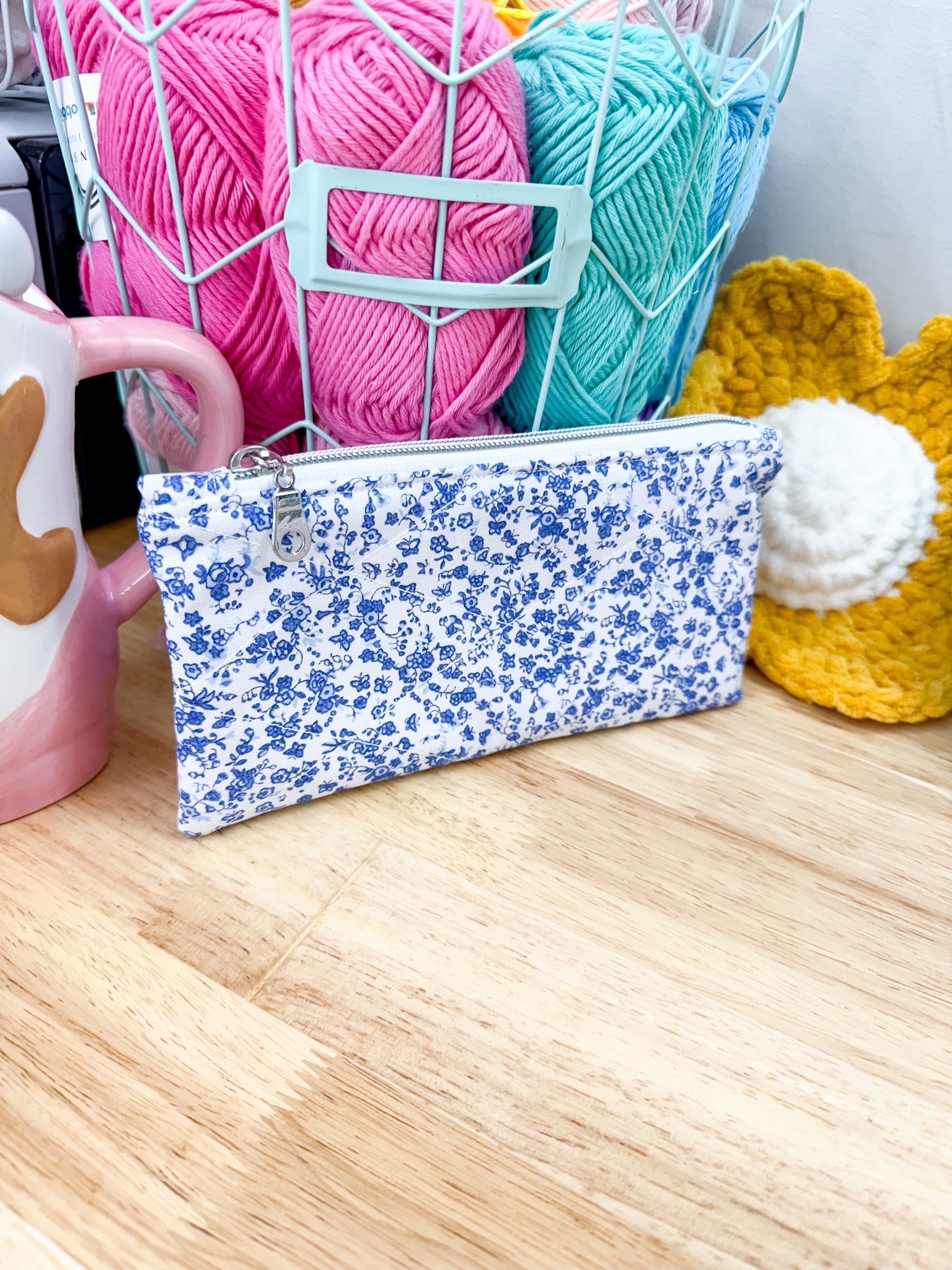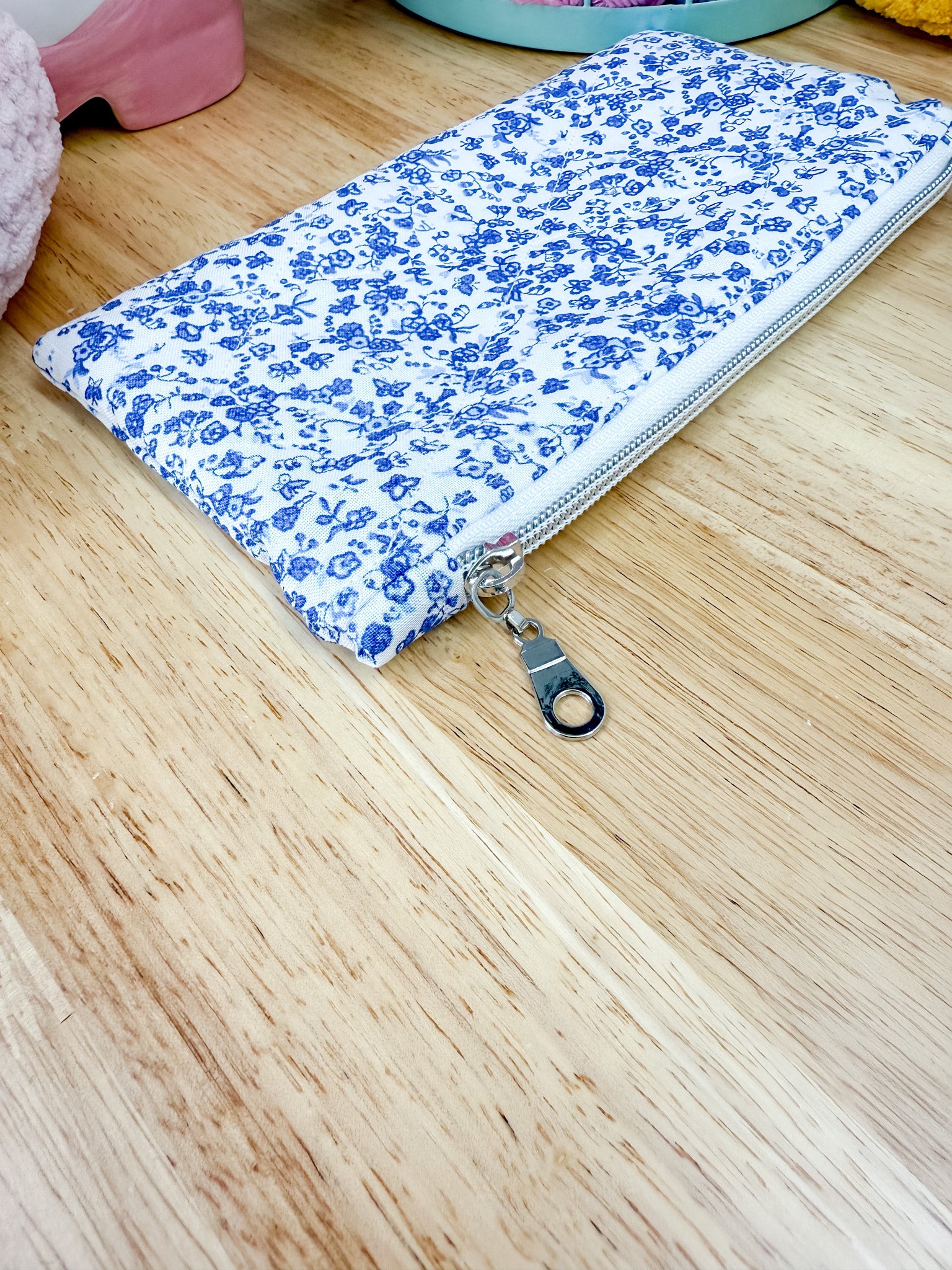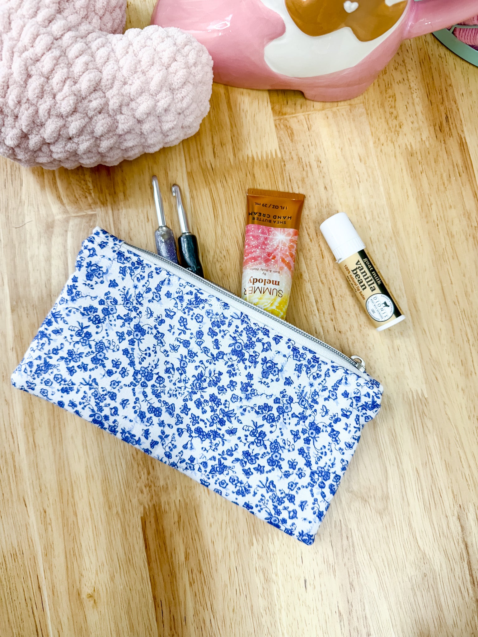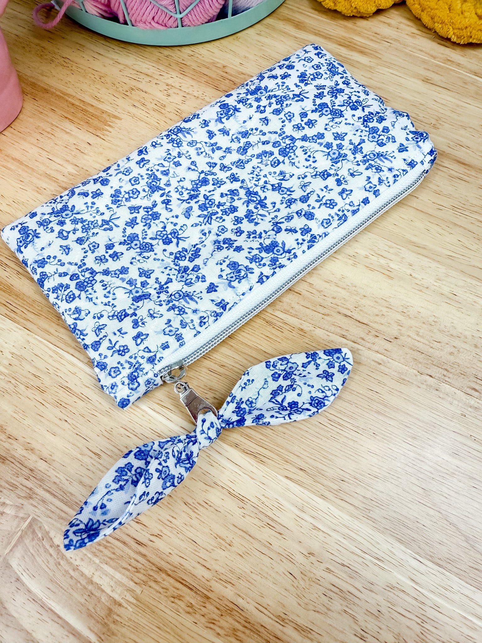 Blue & White Floral Flat Quilted Bow Pouch
