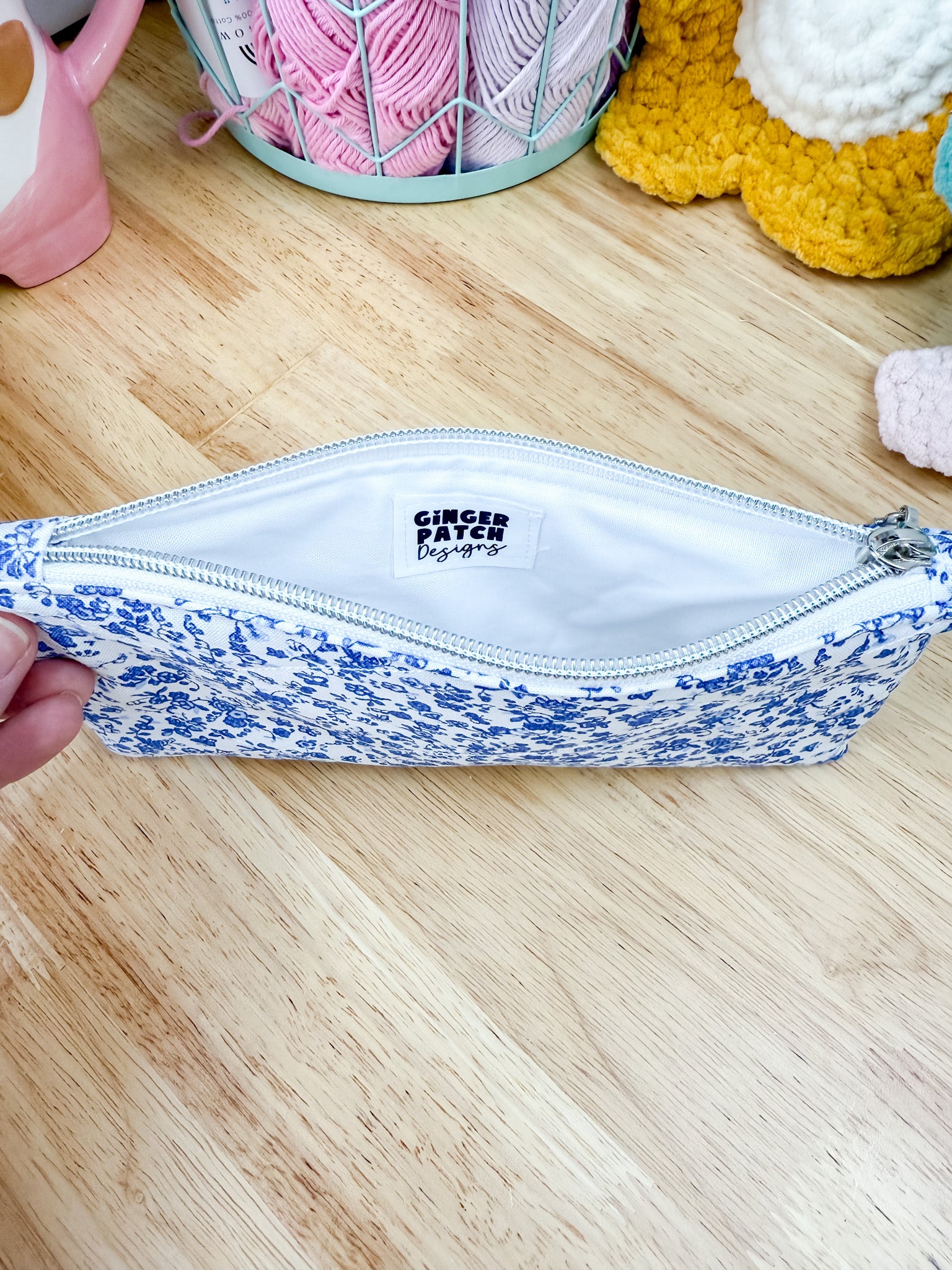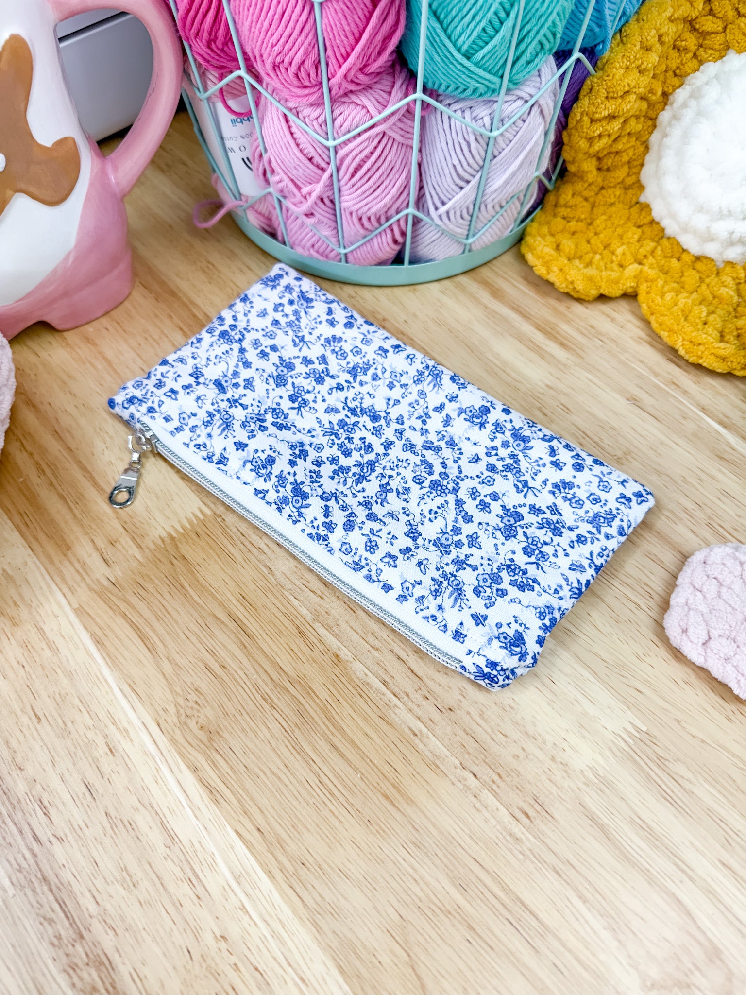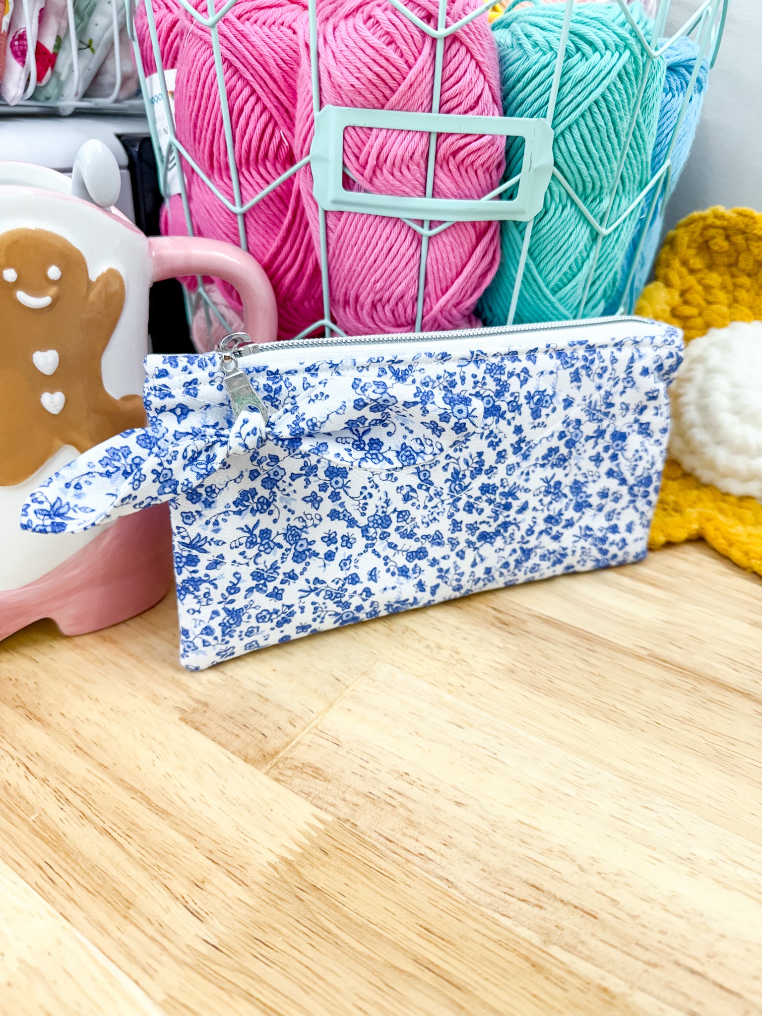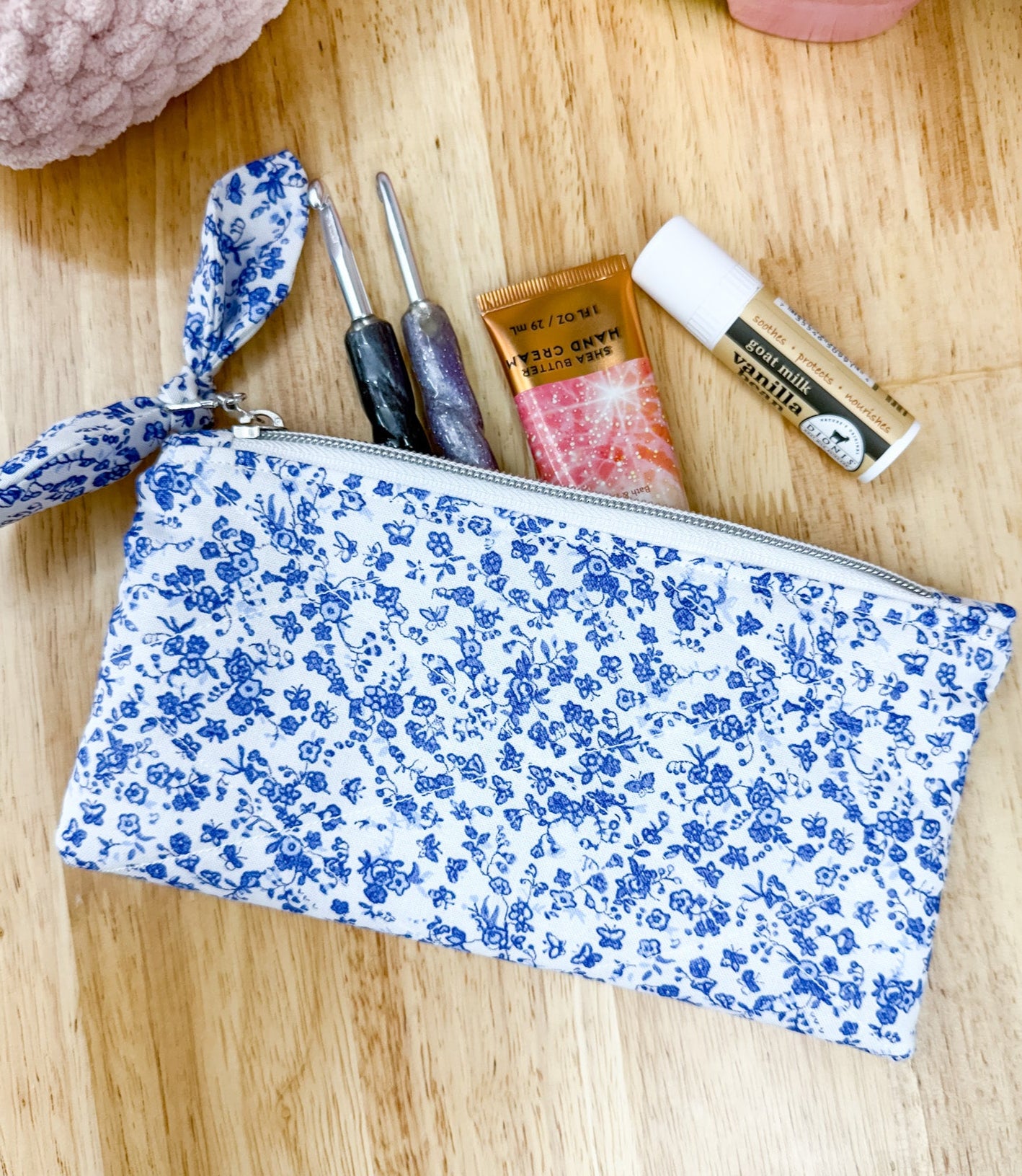 Blue & White Floral Flat Quilted Bow Pouch